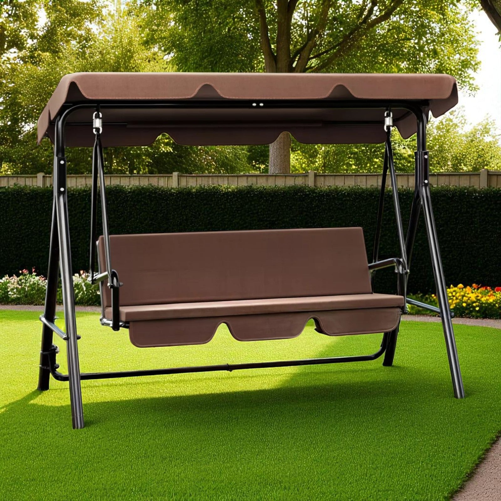 With a 52 inch wide bench and a total weight limit of 660 lbs, this swing easily accommodates up to three people. Ideal for family use or relaxing with friends in outdoor settings.