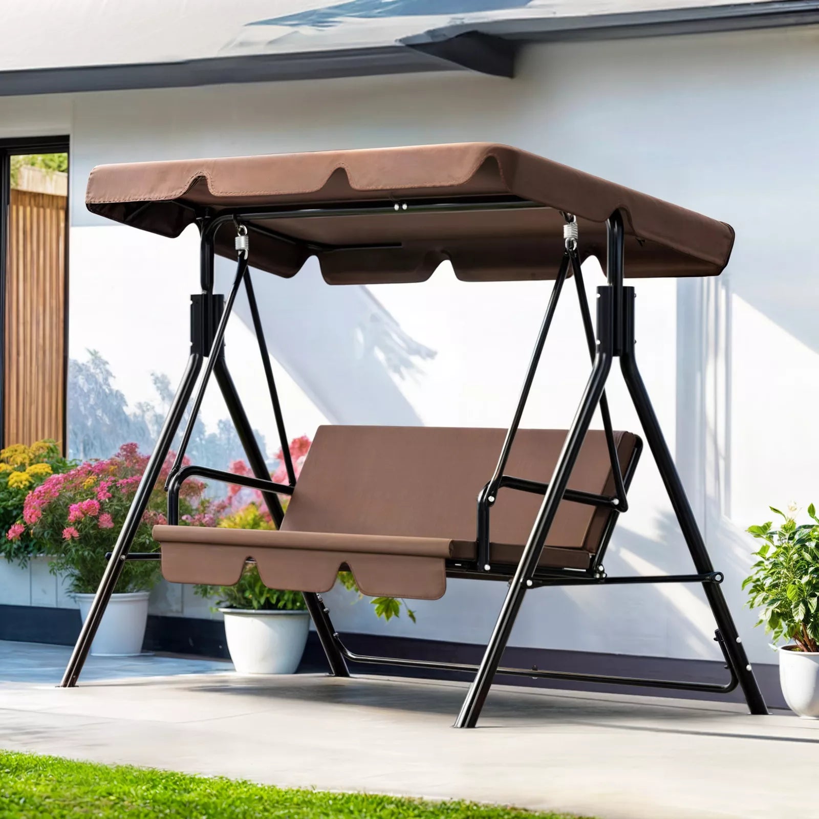 Waterproof, UV resistant fabric resists fading and wear. Suitable for patios, rooftops, gardens, and balconies, this swing fits a variety of outdoor living areas.