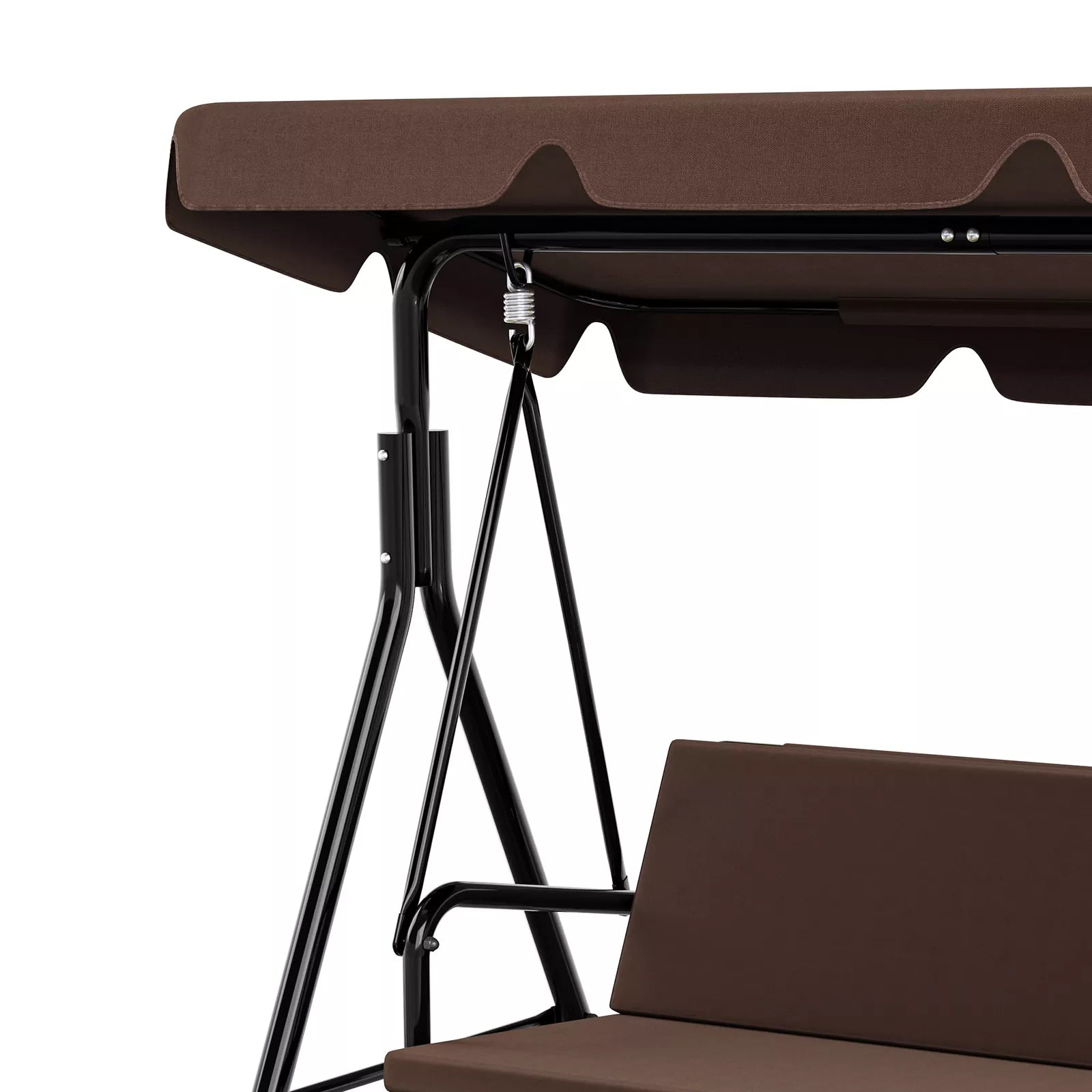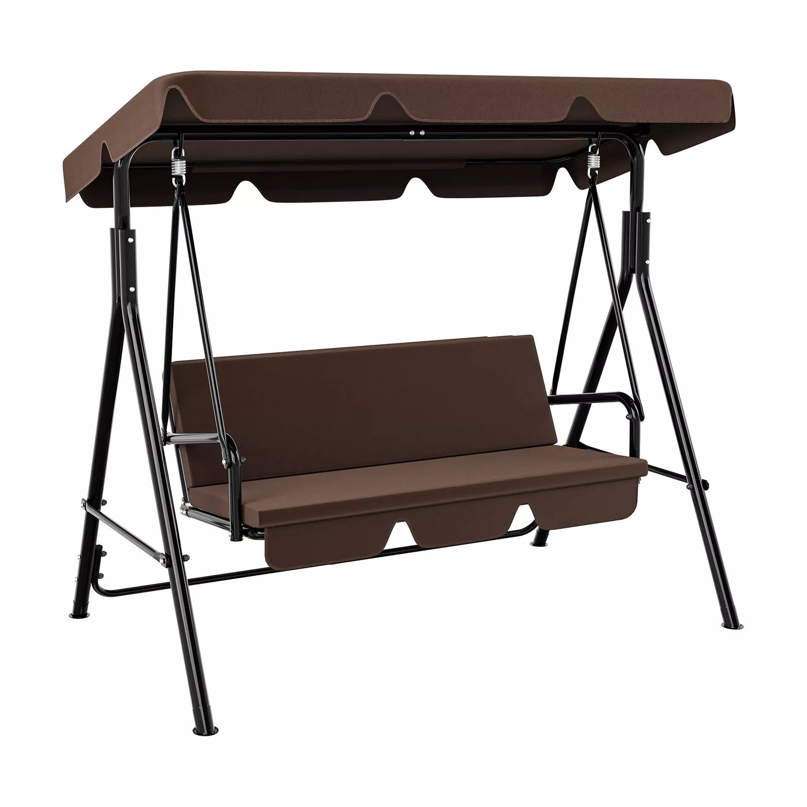Constructed from powder coated steel, the black frame is weather resistant and built for strength. Its triangular support design and integrated spring hooks ensure safe, stable swinging.