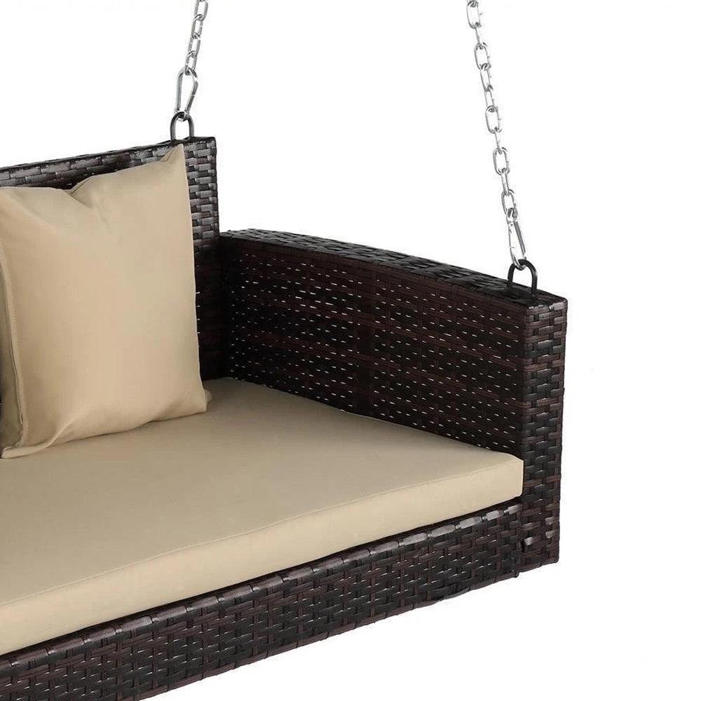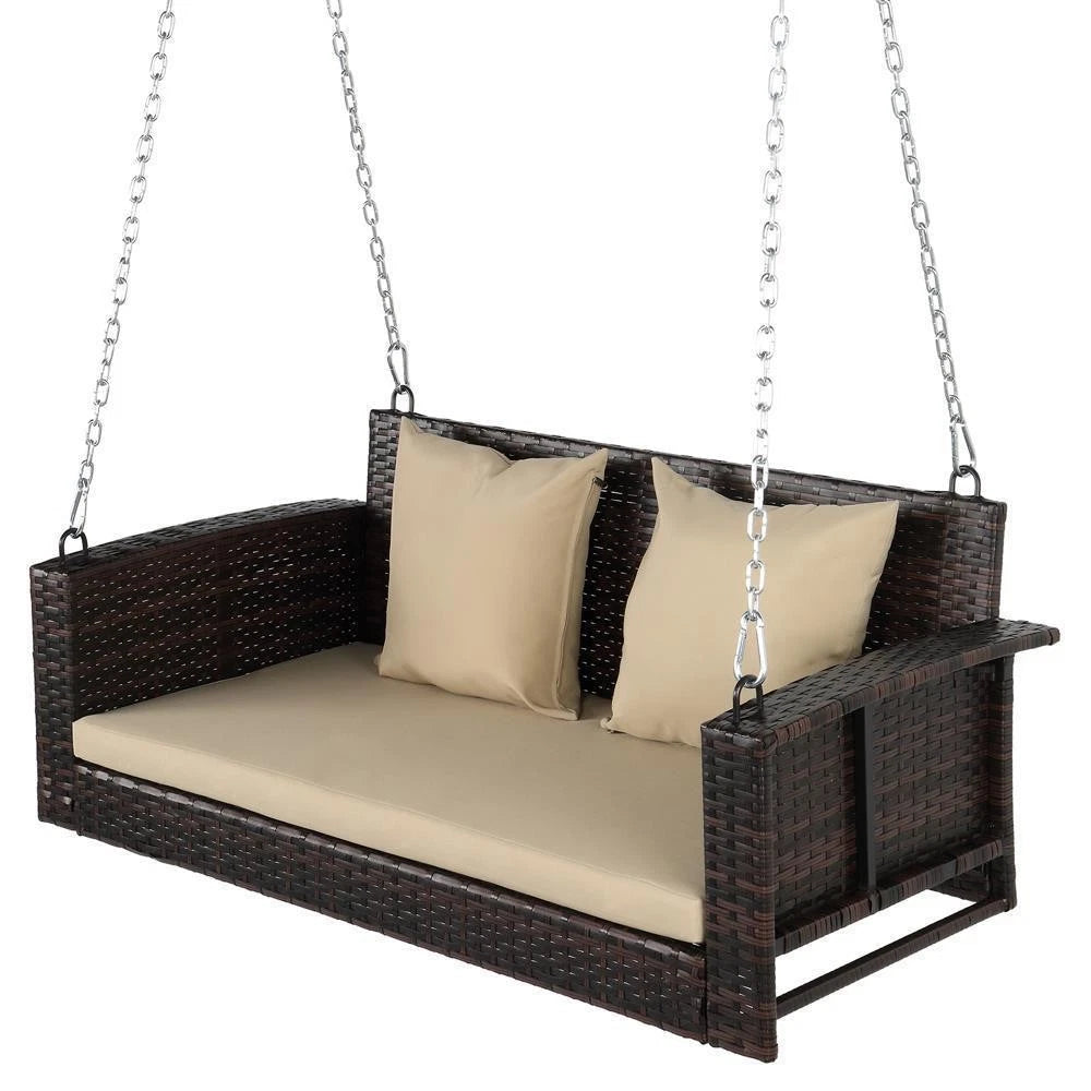 With a rustic rattan look and neutral beige tones, this swing blends easily with modern, boho, or traditional patio settings. Ideal for porches, balconies, gardens, and pergolas.